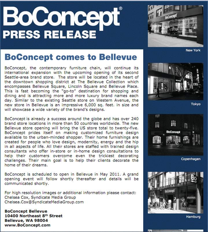 BoConcept opened its first store in Paris in 1993 and now has more than 240 brand stores in 50 countries around the world. BoConcept’s original Seattle location at Western Avenue opened in 2008. The Bellevue store will feature 6,000 sq. ft. of furniture and accessories, personal design consultation services, trend workshops and more.