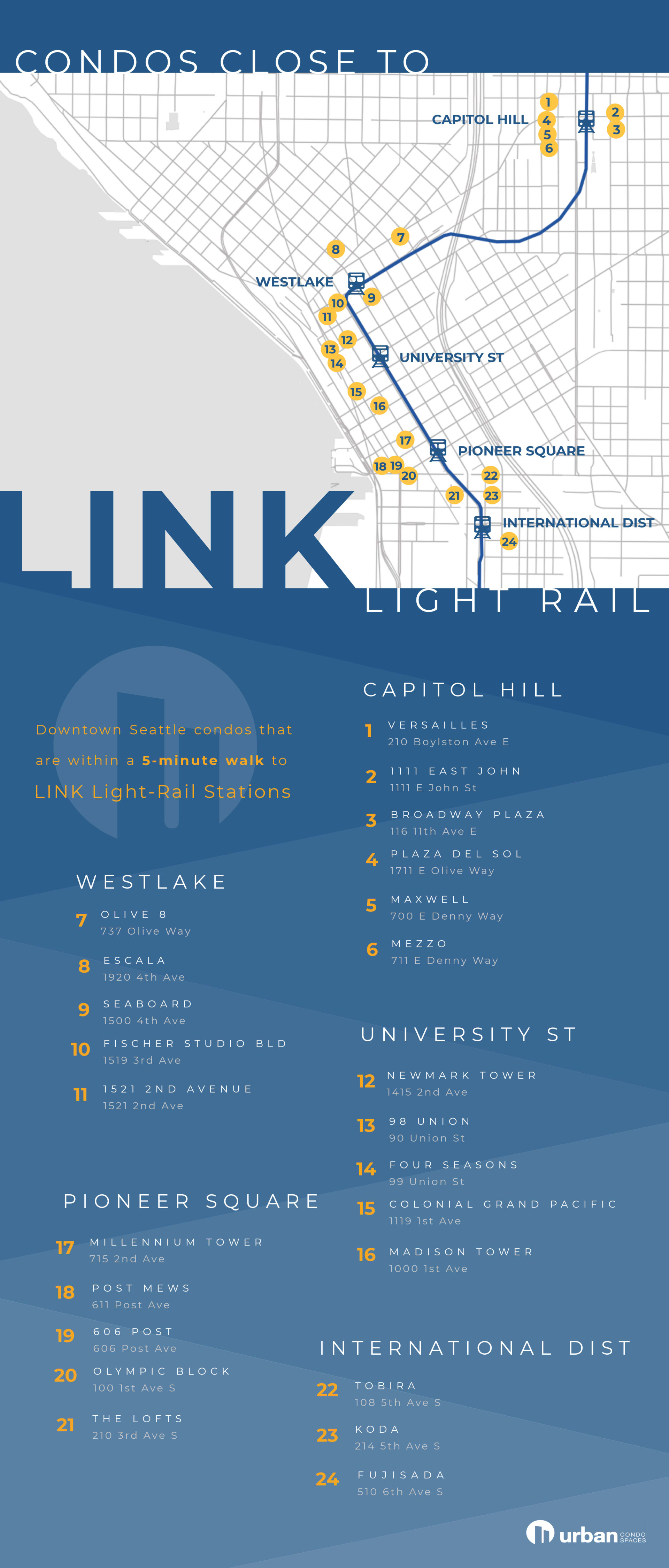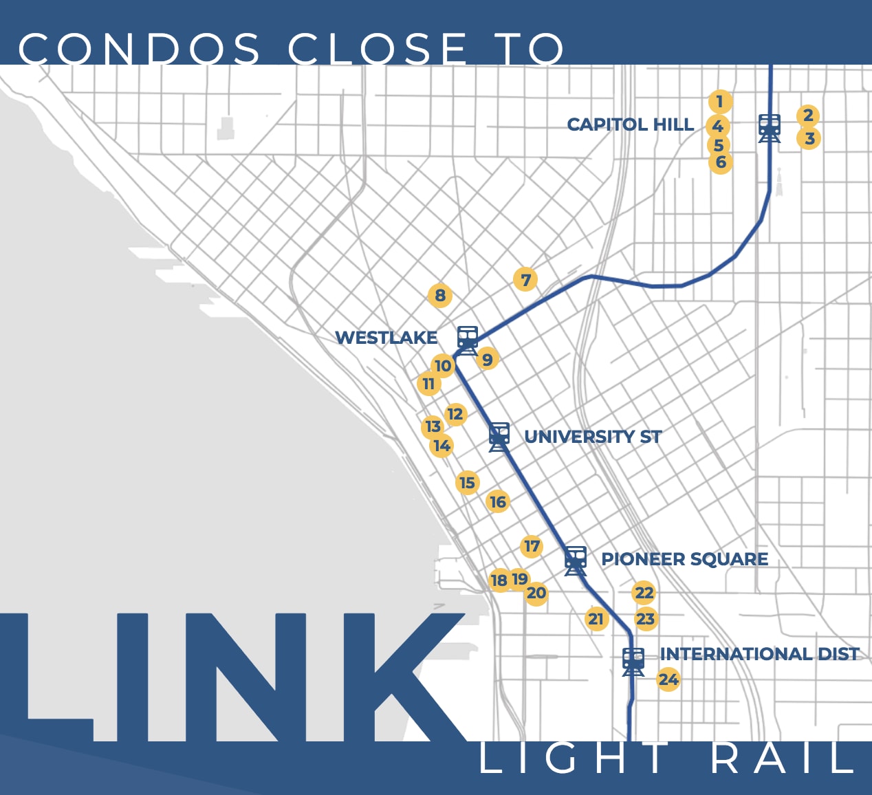 Are there more Seattle condos within walking distance of these light rail stations? Yes, of course. These are just the 24 condos that are within a 5 minute walk. I’m not necessarily endorsing all of these projects either. In fact, when buying a condo there are a ton of factors we have to consider. I’m always happy to help you guys get up to speed on some of my favorite Seattle condo buildings – just ask [email protected]