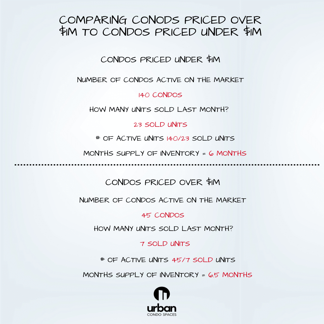 Another useful way to track absorption rate is the by looking at condos priced above $1M and condos priced under $1M. Let’s explore an example I’ve used below for the Downtown Seattle condo market.