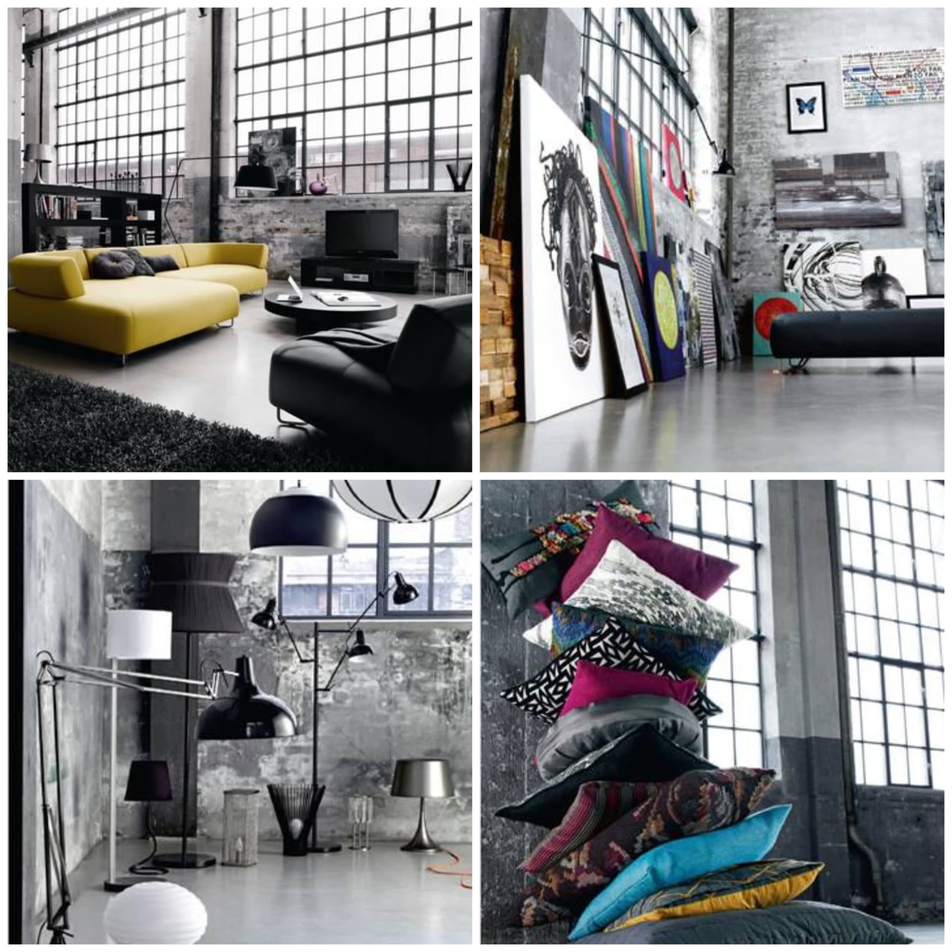 Consider stainless appliances, steel structure beams, and an industrial kitchen island with space for pots, pans, and dishes