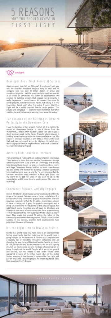 Watch the video below for my 5 reasons to purchase at First Light. I break down each of the 5 reasons and why I think you should invest. For me, this is an exciting time to be in Seattle. This is the first time in 15 years in the business that I have decided to purchase a pre-sale condo!