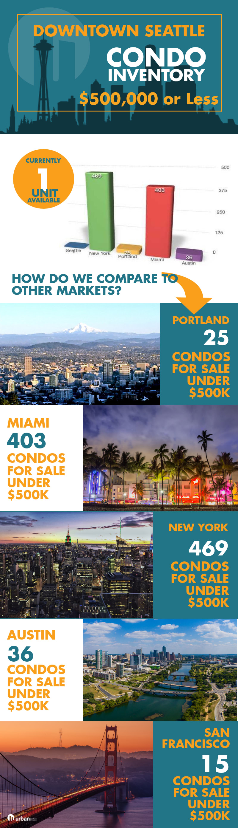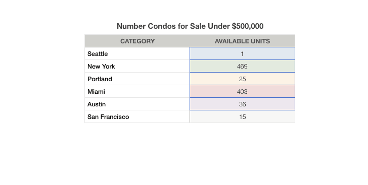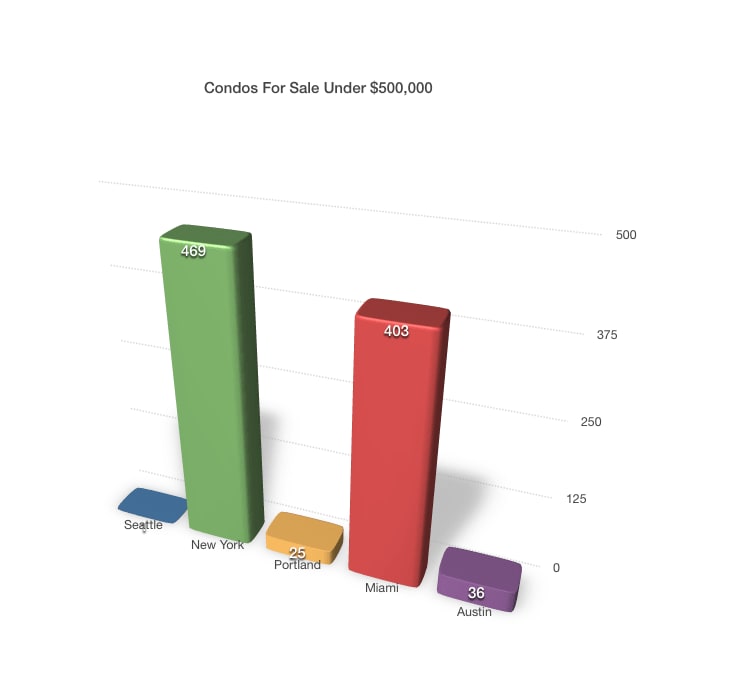 This is an updated graphic we posted in October of last year. Right now, in Downtown Seattle, there is just one unit priced under $500,000. Meanwhile, in Manhattan, there are 469 units under $500,000.
