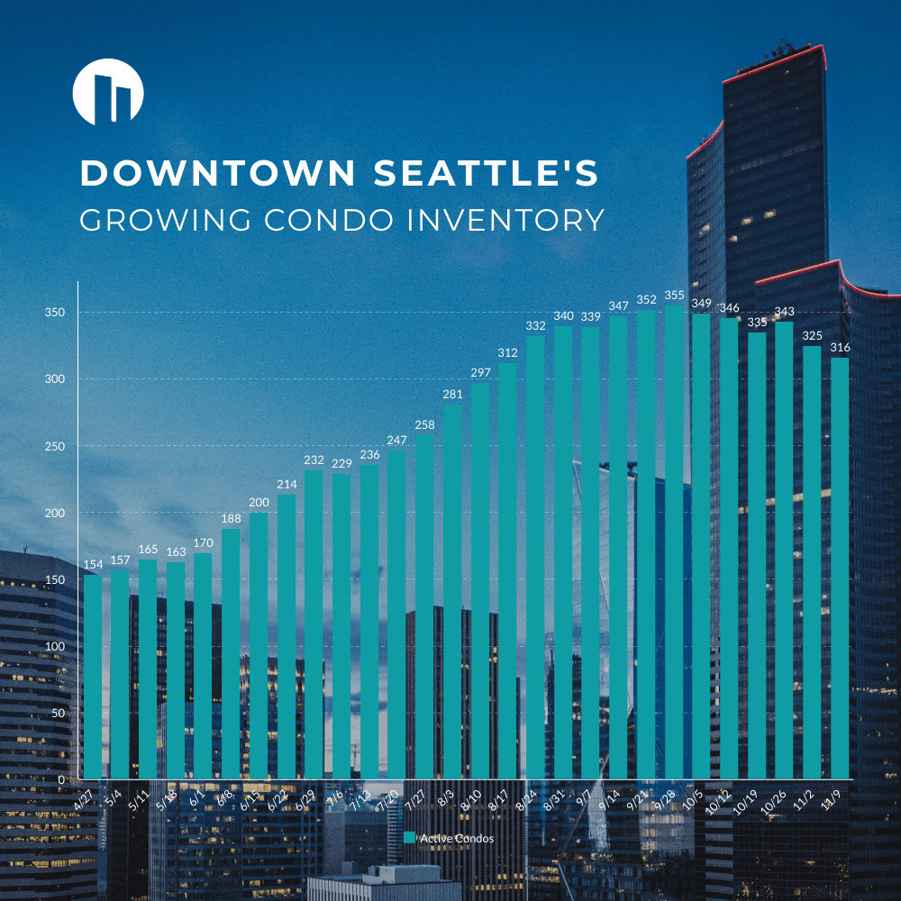 This week shows yet another decrease in Seattle condo inventory. I have been keeping week over week data showing the total number of Seattle condos for sale. As you’ll see below, back in late April, we had just 154 units on market. Inventory peaked at 355 units and now the trend appears to be going lower – currently at 316. With that said, it is not exactly how it appears.